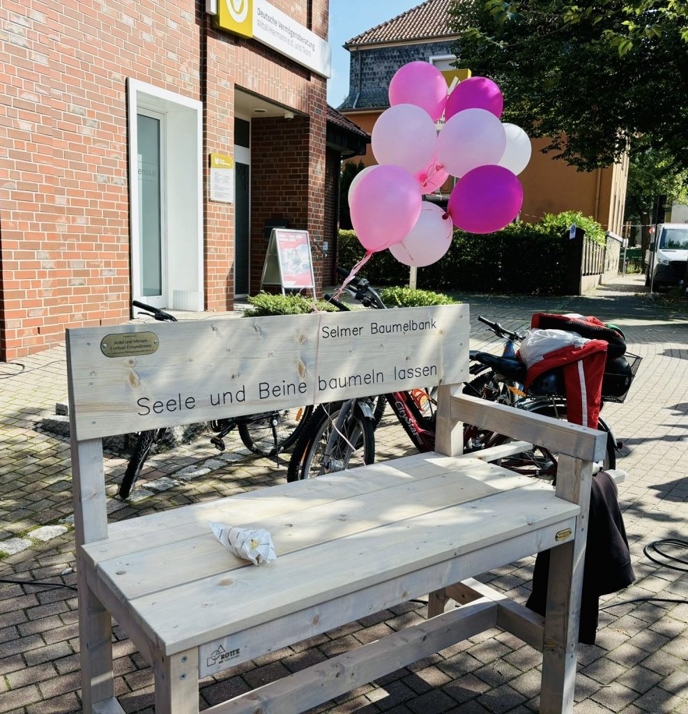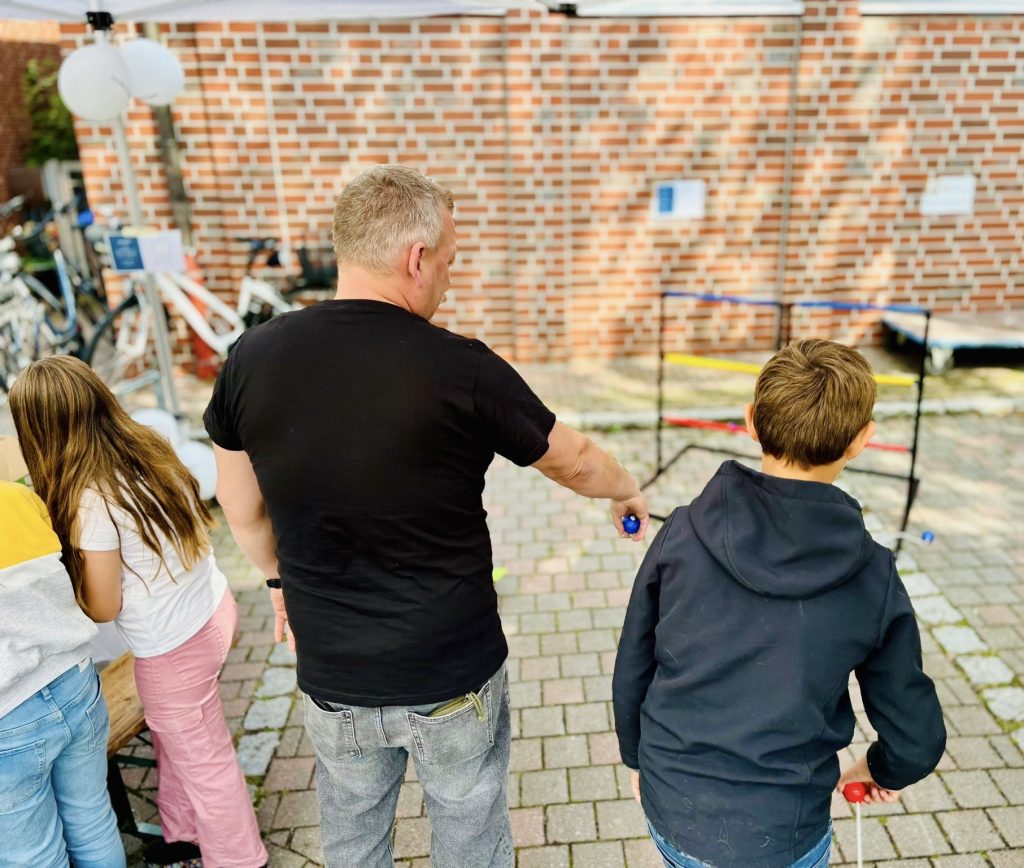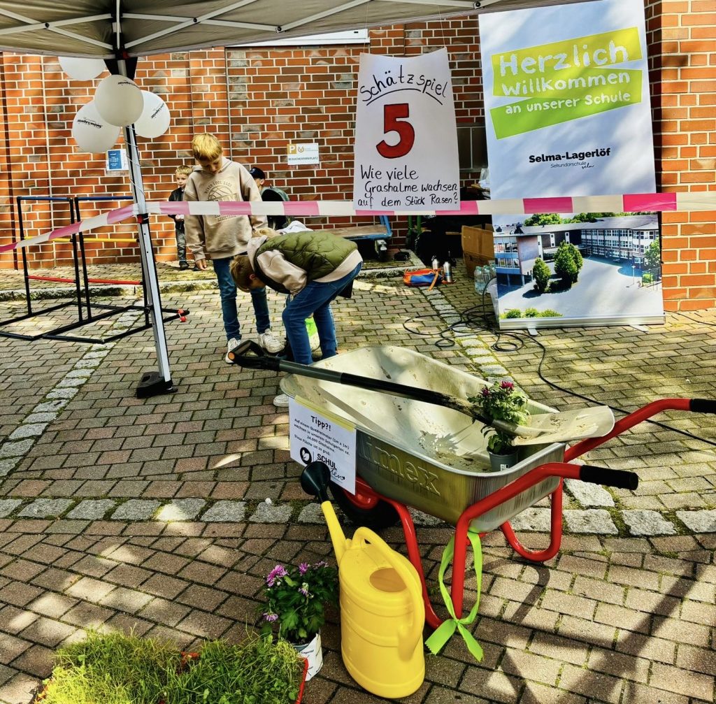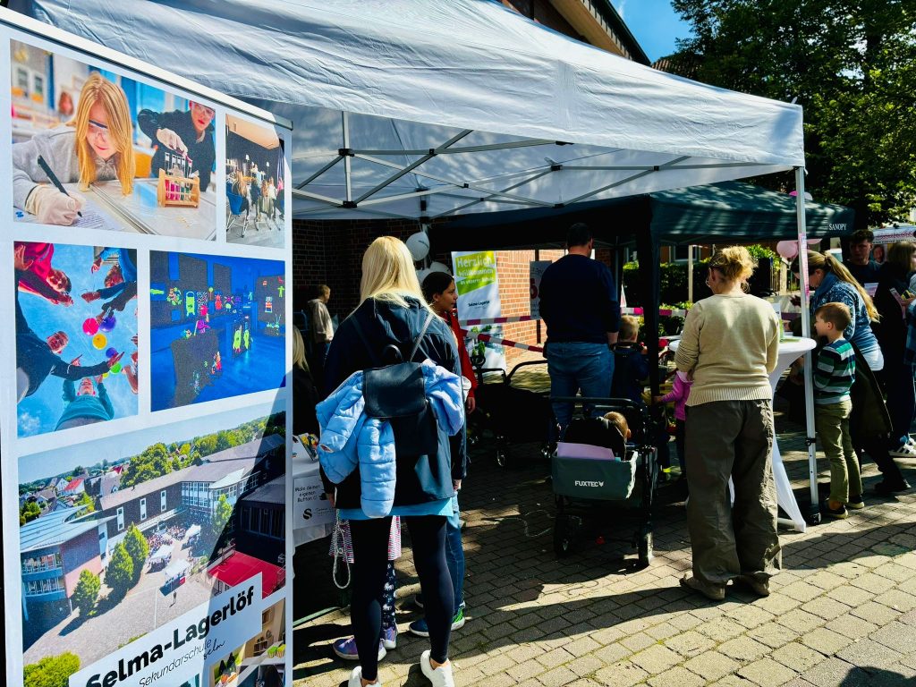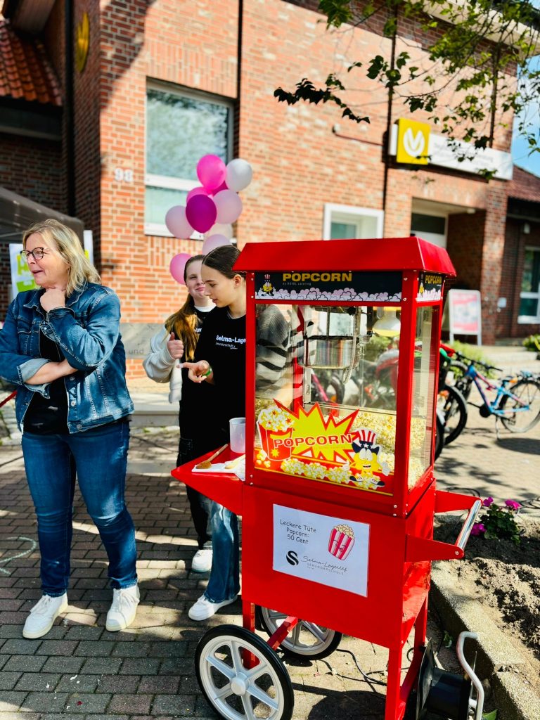 Kolleginnen und Kollegen vertraten gemeinsam mit Schülerinnen und Schülern unsere Schule und präsentierten an unserem Stand ein buntes Angebot. Neben der Möglichkeit nette Gespräche bei einer Tüte Popcorn zu führen und dabei eine der Baumelbänke zu testen, gab es ein Spieleangebot sowie die Chance, einen eigenen Button zu gestalten und mitzunehmen.