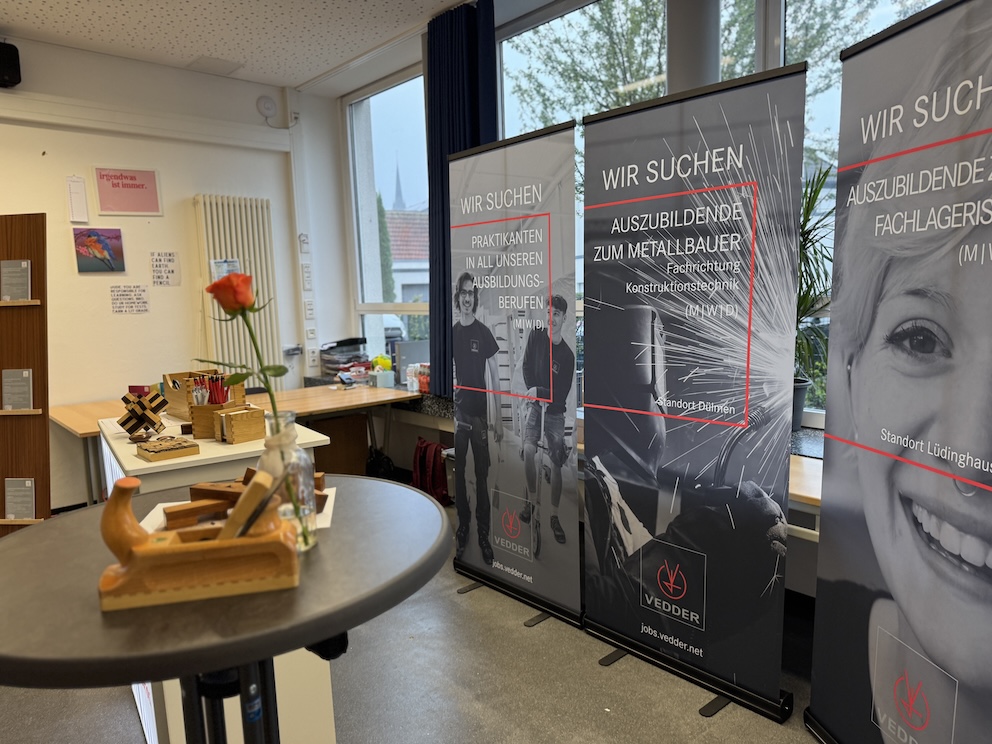 Einmal im Jahr veranstalten wir seit 2023 an unserer Schule eine Berufswahlmesse – die nächste findet am 07.10.2025 statt – , die speziell für die Klassen 8 bis 10 geöffnet ist. Diese Veranstaltung ist ein bedeutender Bestandteil unserer Berufsorientierung und bietet den Schülerinnen und Schülern die Möglichkeit, sich intensiv mit ihrer beruflichen Zukunft auseinanderzusetzen.